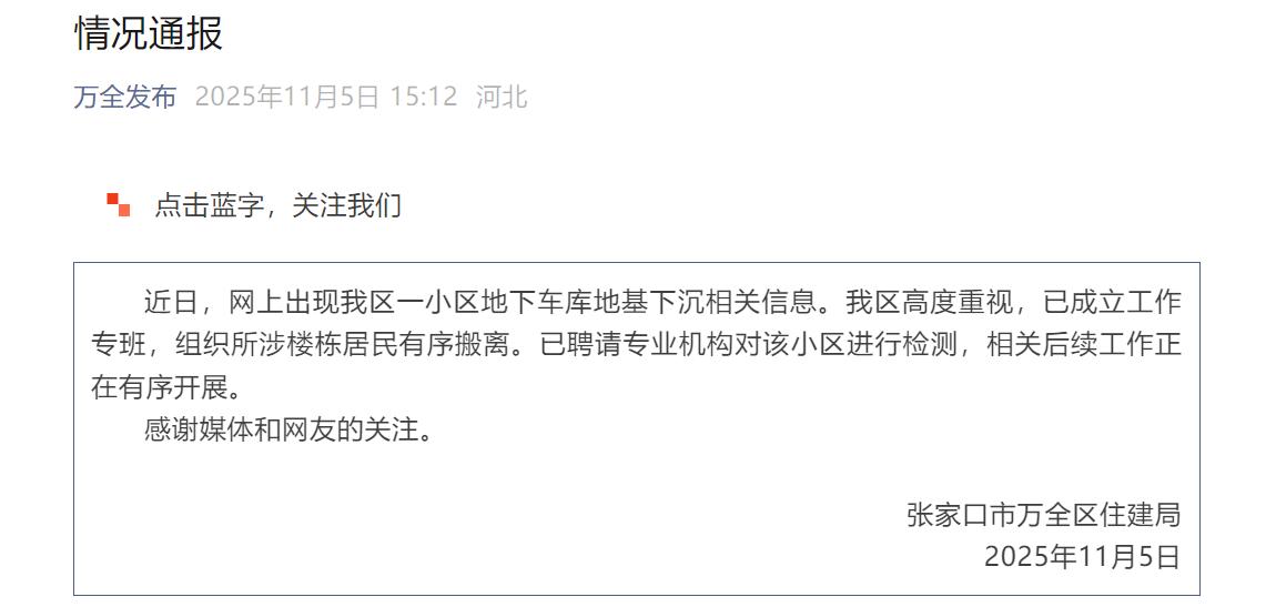 11月5日,张家口市万全区住建局发布《情况通报》称:“近日,网上出现我区一小区地下车库地基下沉相关信息。我区高度重视,已成立工作专班,组织所涉楼栋居民有序搬离。已聘请专业机构对该小区进行检测,相关后续工作正在有序开展。”