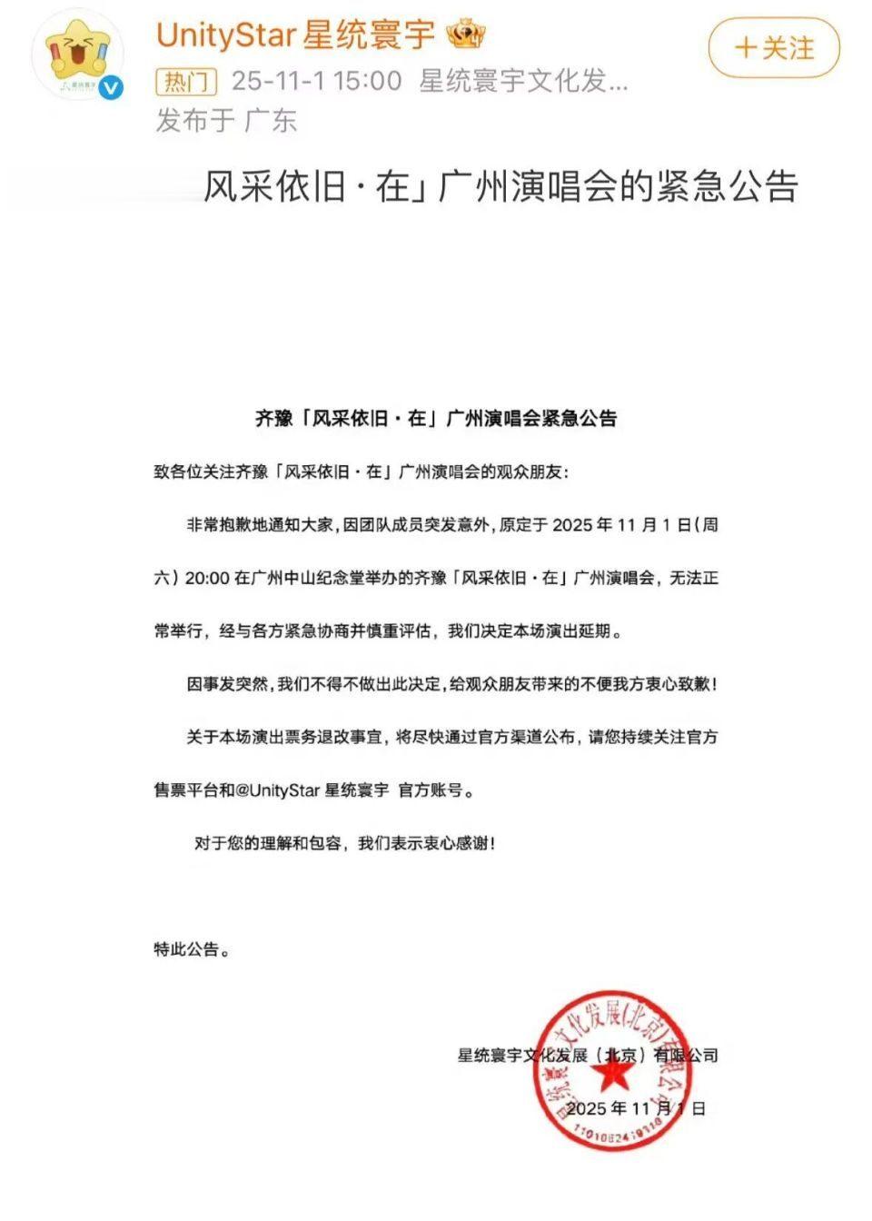 今天下午,星统寰宇文化发展(北京)有限公司(下称“星统寰宇”)官方微博发布紧急公告:因团队成员突发意外,原定于2025年11月1日20点在广州中山纪念堂举办的齐豫「风采依旧·在」广州演唱会延期。