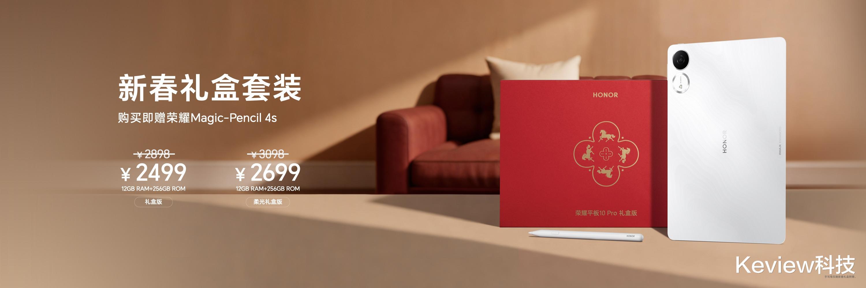 荣耀平板10 Pro于1月9日10:08全渠道正式开售,12GB+256GB标准版售价2499元、12GB+256GB柔光版售价2699元,全新手写笔荣耀Magic-Pencil 4s售价399元;此次将所有配置都升级为新春礼盒套装,12GB+256GB礼盒版现价2499元,12GB+256GB柔光礼盒版现价2699元,购买即赠荣耀Magic-Pencil 4s手写笔;荣耀平板X10 Pro于1月9日10:08全渠道正式开售,8GB+128GB版本售价1499元、8GB+256GB版本售价1699元、8GB+256GB柔光版售价1899元。