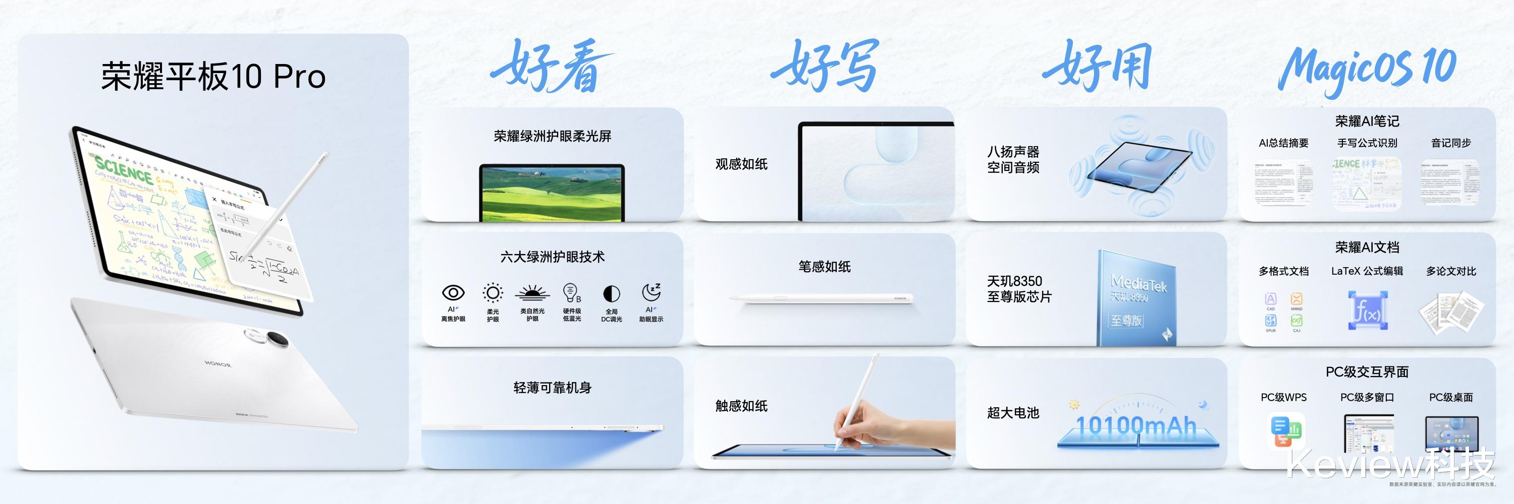 同时发布的荣耀平板10 Pro,搭载144Hz绿洲护眼柔光屏与天玑8350 至尊版芯片,机身超轻薄可靠,并且首发马年新春礼盒,内含时隔两年全新发布的“荣耀Magic-Pencil 4s手写笔”,让书写更流畅。还带来荣耀平板X10 Pro,搭载2.5K护眼柔光屏,荣耀学习空间、8300mAh超大电池等配置,提供“一块好屏,全家乐享”的视听学习体验。