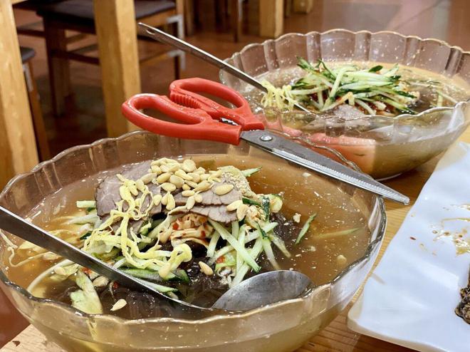 通常冷面的汤上飘着一层冰碴子,这看来也不怪东北人称其为冷面,一口下去,说不定真的会冷的人打哆嗦。荞麦面入口筋道爽滑,味道酸辣中带着股鲜甜,牛肉、苹果、辣白菜等各种配料吃起来口感层次极为丰富,夏天来上一碗真的是过瘾。
