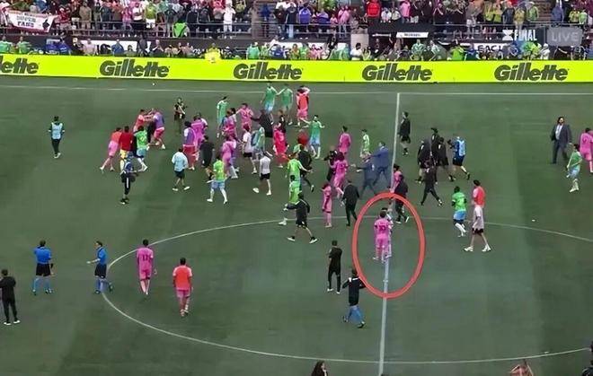 与此形成鲜明对比的是梅西的表现。整场冲突中,他始终站在中圈附近,双手叉腰冷静观察着眼前的混乱,脸上看不到丝毫愤怒,只有深深的无奈。后来西雅图7号球员罗尔丹主动走过来,友好地拍了拍梅西的肩膀,两人简短交谈。从梅西的表情判断,对方很可能是在说:很抱歉让你看到这样的场面。