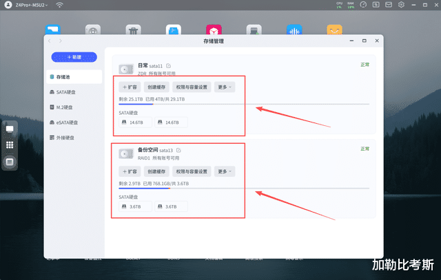 2、存储容量,真大现在所有品牌的NAS都支持多个存储池,我可以2块盘组成ZDR阵列,2块盘组成RAID1阵列。重要数据放在RAID1上面,不重要的就放在ZDR里面。多块硬盘组合下,轻松上30TB容量。