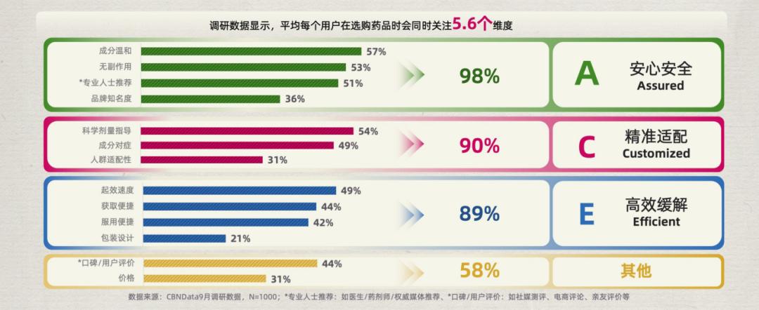 这种对效率的追求,在《方案》中也得到了系统呈现。有49%的消费者将“起效速度”视为选药的核心维度之一,而他们对“快”的理解,也已形成从感知到获取的完整闭环。
