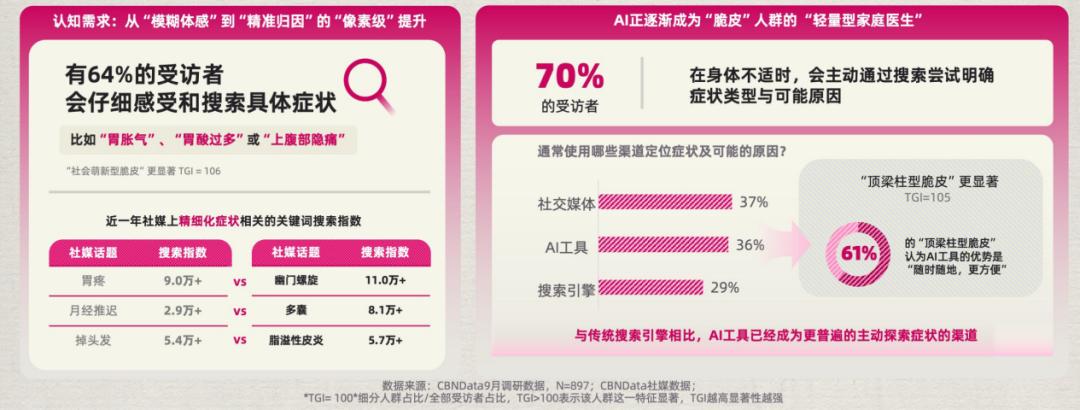 有70%的受访者在身体不适时会主动搜索,尝试明确症状类型与可能原因,如幽门螺杆菌感染、脂溢性皮炎,而非以往胃痛、脱发这些模糊的表述,这种对健康问题“像素级”的深究,开始让补偿行为有的放矢。