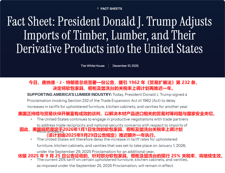 2026年1月,美国白宫官网一纸公告引发跨境电商圈关注:总统特朗普正式签署总统令,将原定于1月1日生效的软包家具、橱柜及盥洗台加税计划推迟一年执行。