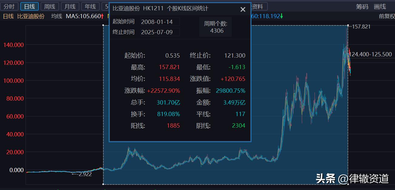巴菲特投资比亚迪,17年回报超30倍2008年9月的时候,巴菲特投资了比亚迪这个看起来不符合他选股标准的股票,以每股8港元入股比亚迪,投资2.3亿美元,持股比例达到9.89%。到2025年完全退出,按照每股8港元计算,比亚迪这笔投资上,巴菲特的回报率约30倍。