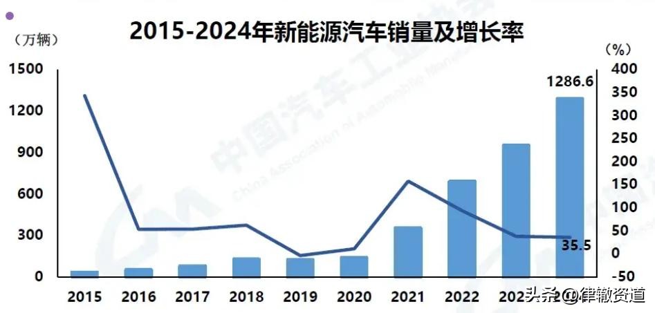2008年全国汽车的销量是938.05万辆,而当年新能源汽车的全年销量只有0.24万台,占比仅有0.025%。2012年中国新能源汽车的销量才超过1万辆,2015年中国新能源汽车的销量突破两位数达到34.04万辆,自此中国的新能源汽车开始进入发展的快车道。2024年中国新能源汽车的销量突破1000万辆。