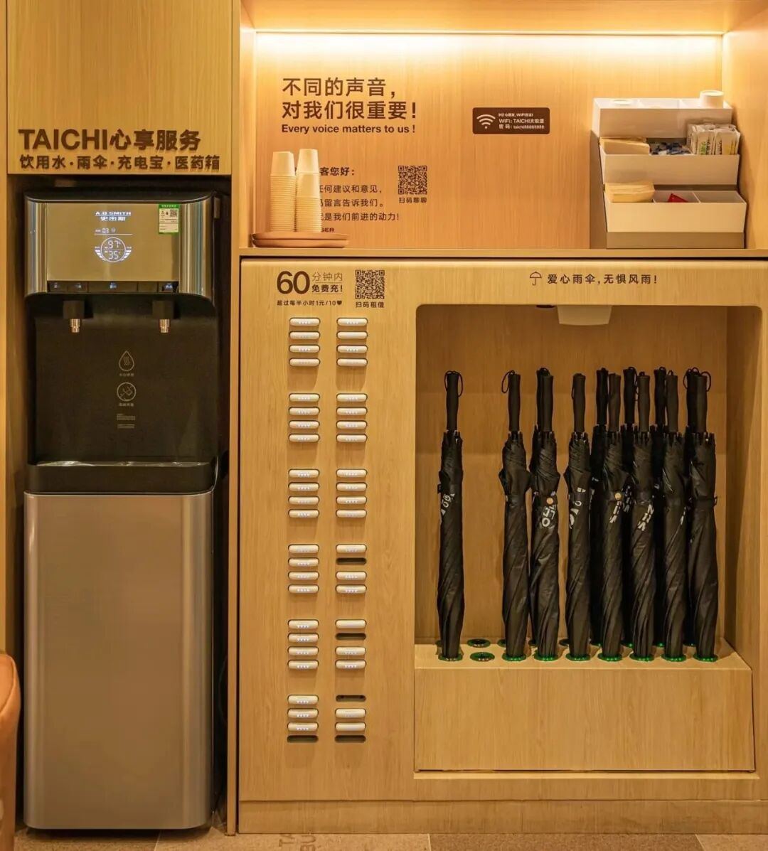 而在服务上,太极堡门店也颇为贴心,设置寄存柜,提供免费Wifi、冷热水、牙线、发圈、充电宝,雨天有爱心雨伞,收获不少顾客好评。