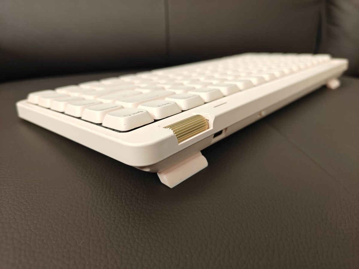 而且键盘的高度设计也符合人体工学,17mm的键盘前高配合约6°的斜坡高度,对日常码字多的小伙伴来说非常合适,久敲也不累!键帽也是采用的是PBT+ABS双色注塑而成的键帽,触感很舒适,不掉字符不打油,打字的时候非常舒服。