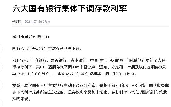 在2024年7月份,各大国有银行就开始调整银行存款利率,中国银行、工商银行以及其他大行的利率下调,对其他中小银行也是一个信号。