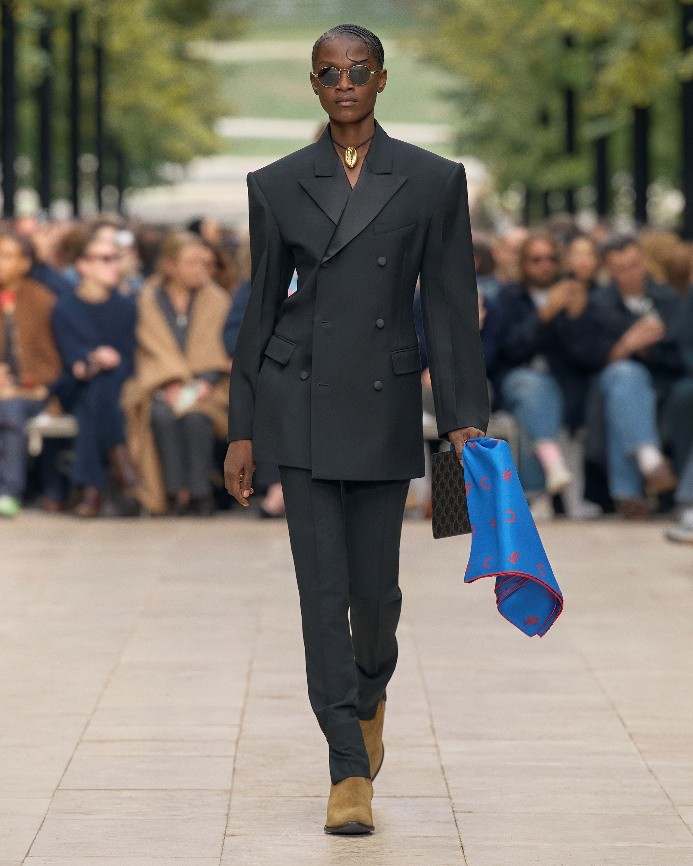 在某些造型中,包袋、丝巾与披肩之间的关系几乎像一场舞蹈。丝巾从包口延伸出来,被风牵引着摆动;披肩的尾端掠过包面,制造一种视觉上的重叠;甚至有些模特手中的包,与衣身的颜色完全一致,使它们融为一个整体。Rider 以极高的控制力,让这些“移动的元素”在行走中呈现出动态的和谐。这种协调的流动感,也正是他在第二个 CELINE 系列中所建立的节奏基础——不再是设计师与品牌之间的“适应期”,而是两种语言的完全融合。