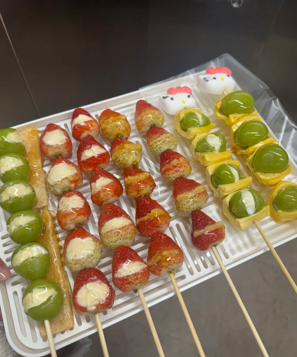 山楂/水果(草莓、晴王葡萄等)为基底,夹入内蒙古传统奶皮子(浓缩牛奶表层油脂制成),外层裹透明糖衣。