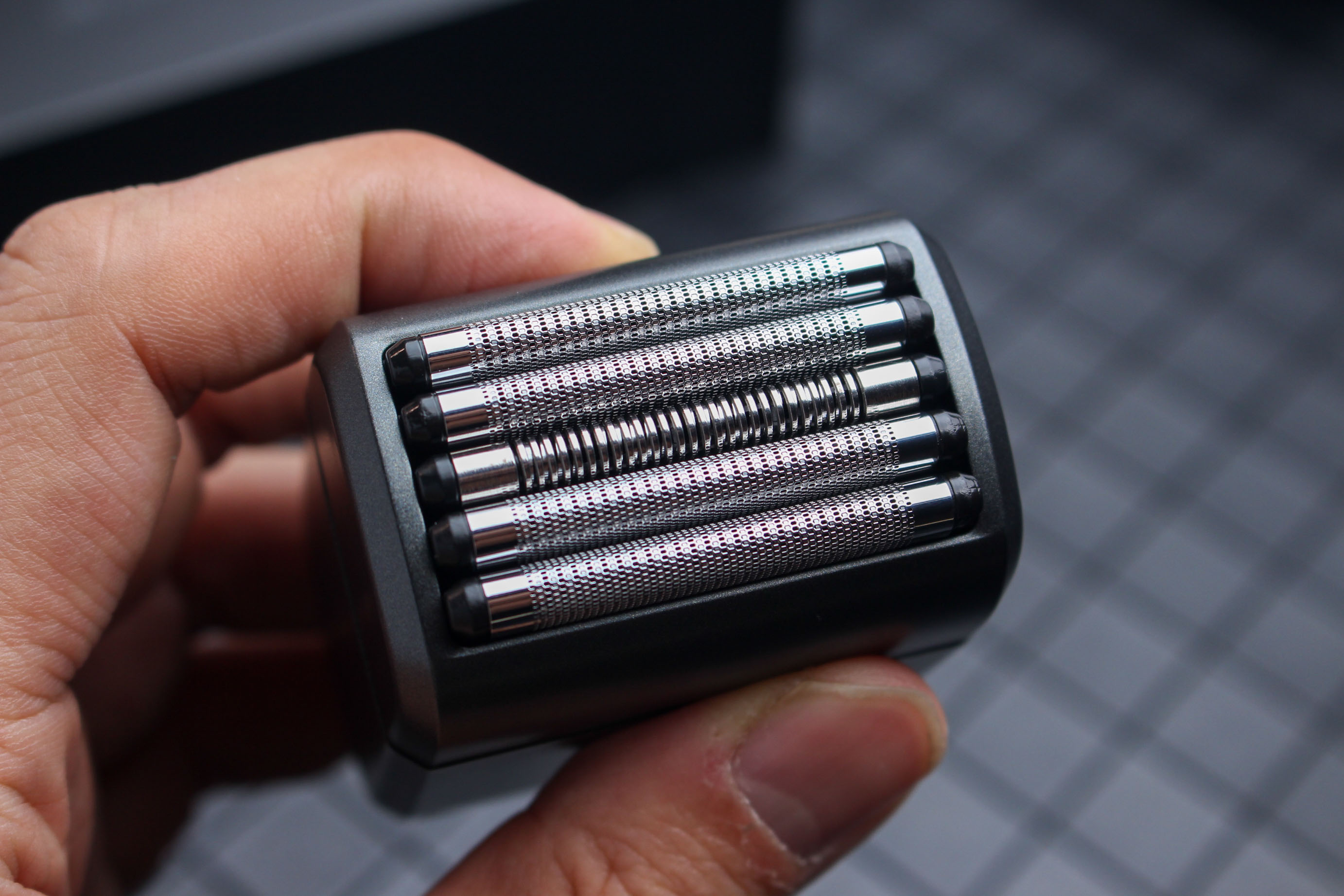 未野MRX mini的采用五刀头设计,包括了四组深剃刀刃和一组中缝梳齿刀刃,相较于传统的三刀头设计,五刀头可以针对不同长度的胡须进行无死角的处理,而且刀头采用韧性喷涂工艺+硬化处理,刀网做到超薄的同时还做了抗腐蚀设计。