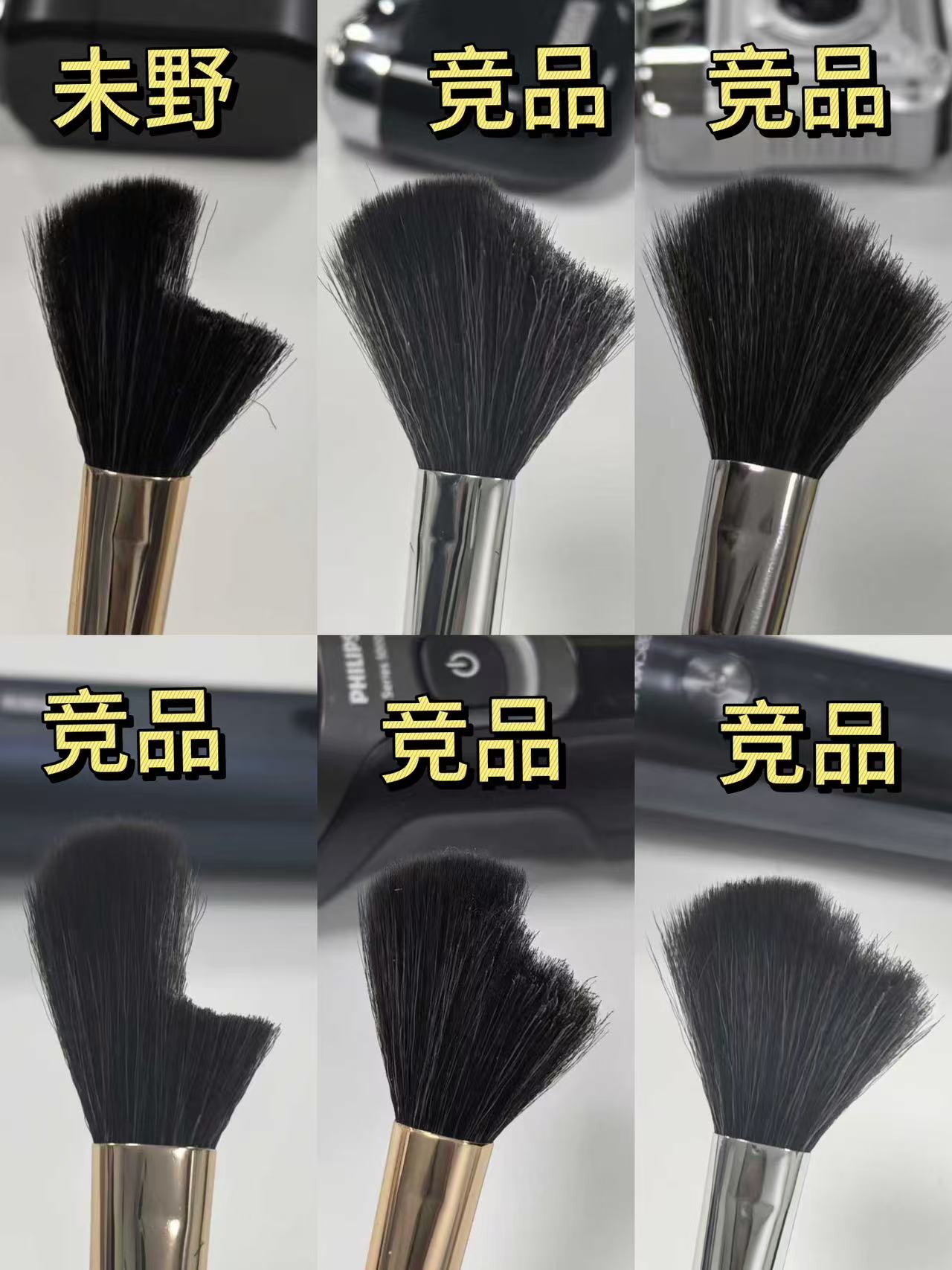 对比一下可以看到未野剃须刀剃过的部分刷毛非常整齐利落,更齐整的切断面意味着更强的剃须能力。