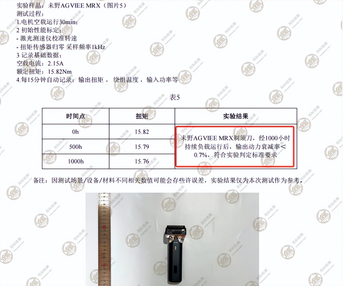 专业机构检测发现未野剃须刀1000小时电机动力衰减度小于0.7%