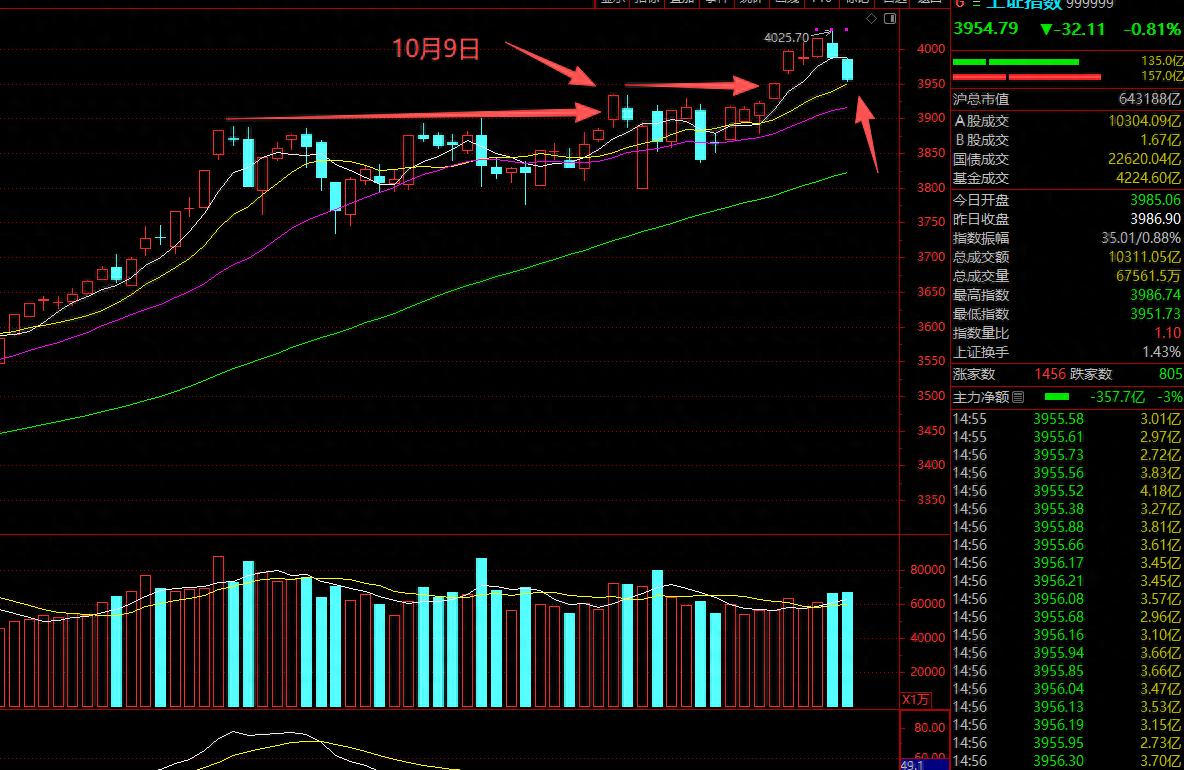 今日为十月收官战,大盘延续下跌,演绎成了虎头蛇尾。三大指数今日集体回调,截止收盘,上证跌0.81%,收报3954.79点;深证成指跌1.14%,收报13378.21点;创业板指跌2.31%,收报3187.53点。沪深两市成交额达到23501亿,较昨日24606亿缩量上千亿。