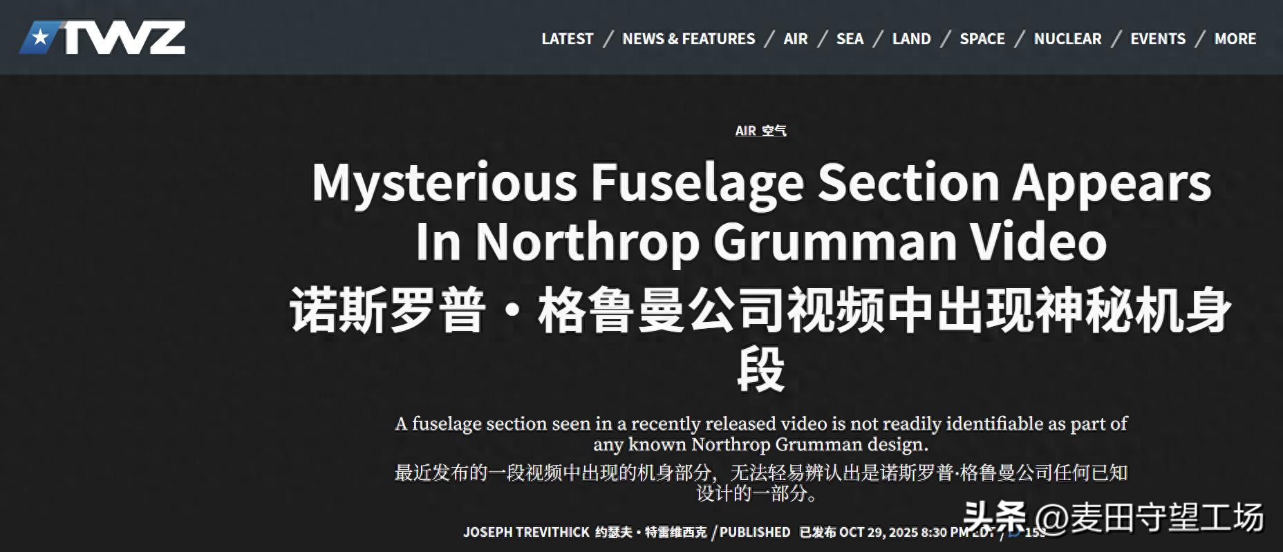 美国不承认自己在六代机研发中落后于人,最近又发布“好消息”,美国媒体《战区》在最近的报道中称,美国六代机打造首个部件,这是根据诺斯罗普·格鲁曼新公开的一段画面中截取的内容,该视频为该公司在2025年第三季度的成就,其中一个画面展示了一个飞机机身部分,似乎并非其已知开发或参与生产的任何机型。