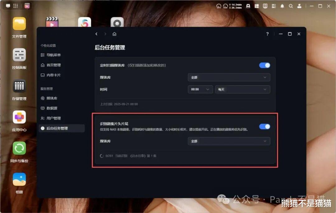 影视中心支持智能识别片头片尾,打开之后NAS会先进行剧集识别分析,识别速度和剧集的大小以及时长有关,熊猫这里200多的剧集内容还是花了一点时间,不过识别途中并不影响NAS的正常使用,对于性能影响并不高,CPU的占用大概不到10%。