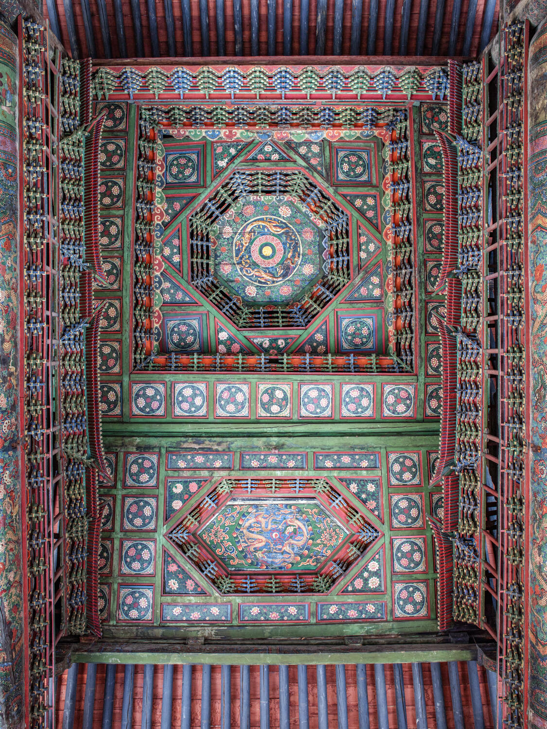 走进殿内,首先映入眼帘的是天花板上那独特的双藻井和天宫楼阁。双藻井结构在古建筑中十分罕见,藻井彩画在清代重修时重新绘制,中心绘有两条金色游龙,栩栩如生,仿佛随时都会破壁而出。穹顶的制作精美绝伦,线条流畅,色彩鲜艳,展现了清代高超的绘画技艺和装饰艺术。天宫楼阁则宛如仙境中的琼楼玉宇,层层叠叠,精致入微,让人不禁为古人巧夺天工的技艺所折服。它们不仅是建筑装饰的一部分,更蕴含着深刻的宗教和文化内涵,象征着佛教中的天界和净土,给人一种神秘而庄严的感觉。