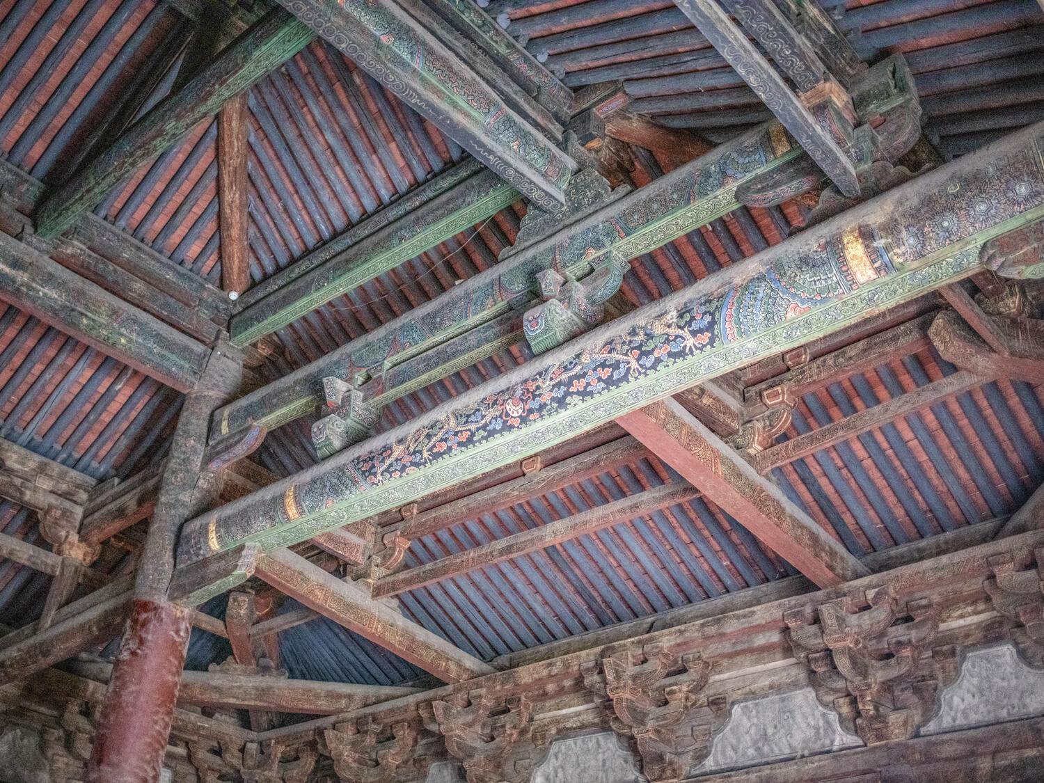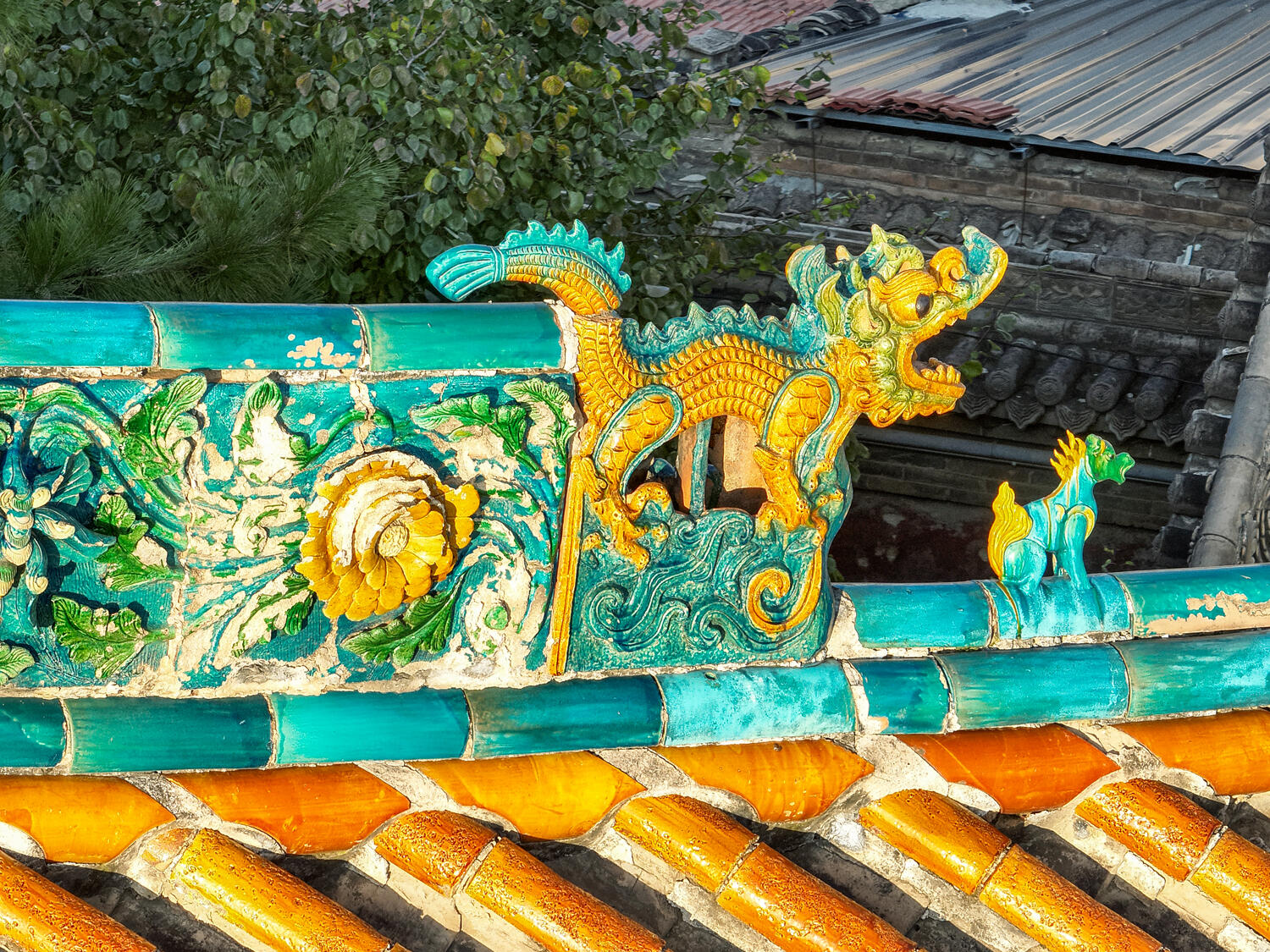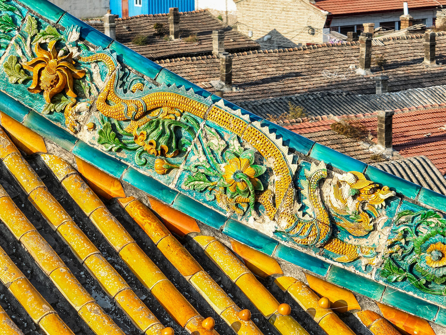 抬头仰望传法正宗殿的殿顶,堆花脊饰令人眼前一亮。脊上鸱吻两两相对,制作精美,造型生动,仿佛随时都会腾空而起。题材丰富多样,有狮子驮宝瓶,寓意吉祥平安;还有八仙过海,充满了神话色彩。这些脊饰不仅是建筑装饰的艺术品,更是古代文化和信仰的一种体现,反映了当时人们对美好生活的向往和对神话传说的热爱。每一处细节都凝聚着工匠们的心血与智慧,也让我们得以窥见元代民间艺术的独特风貌。