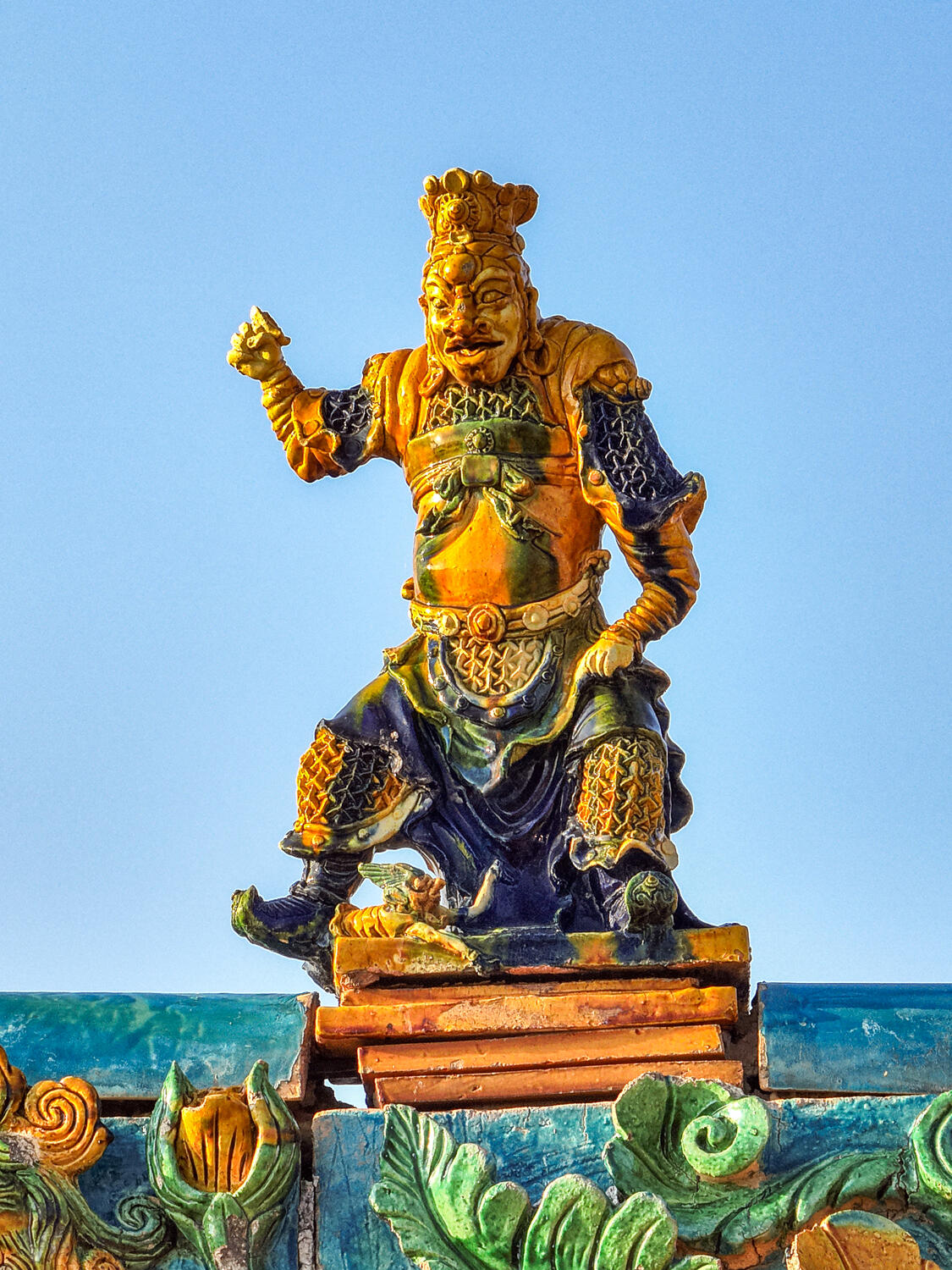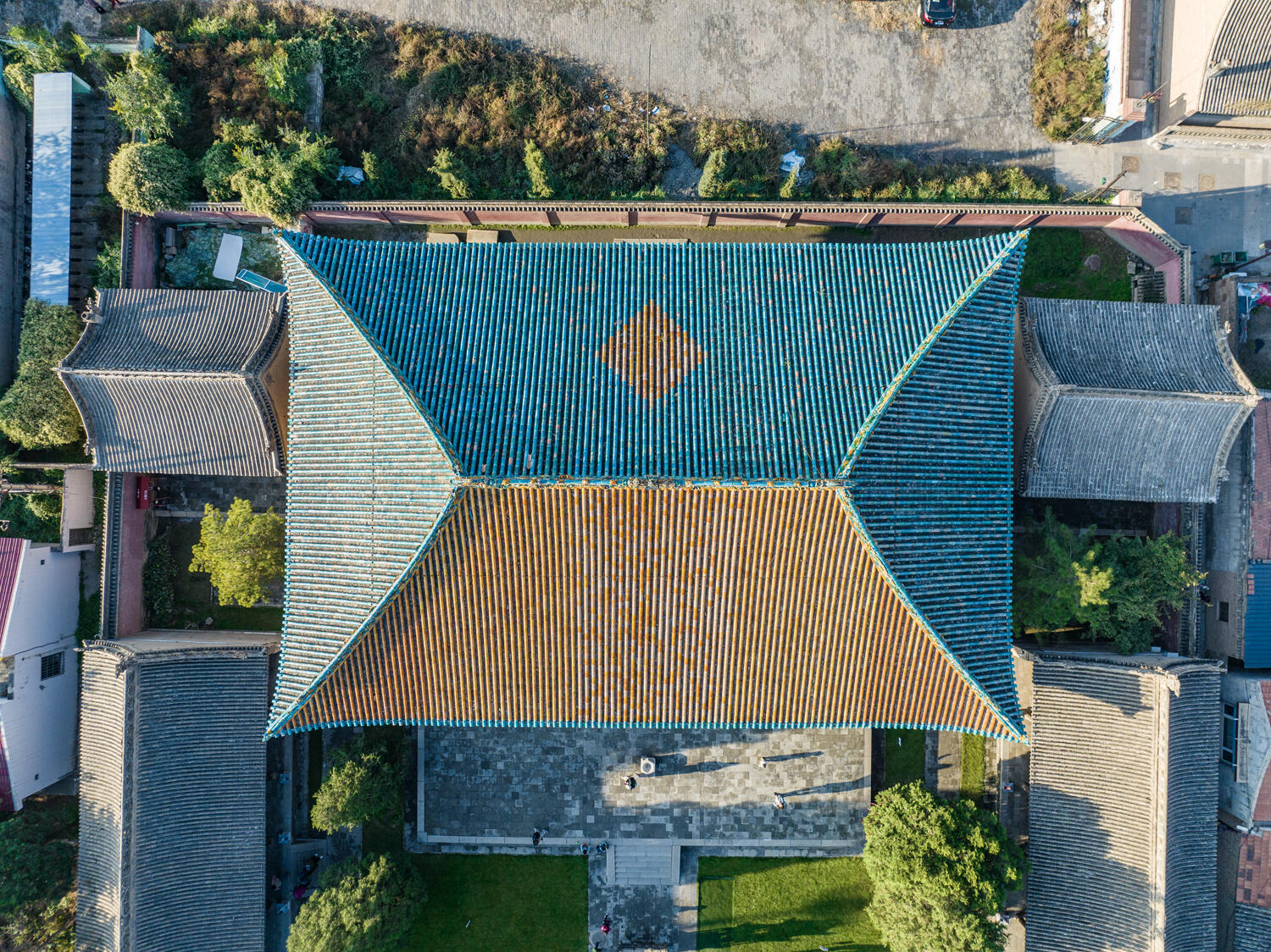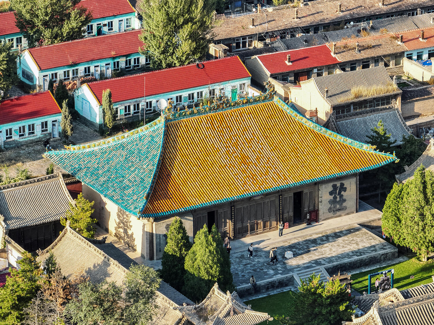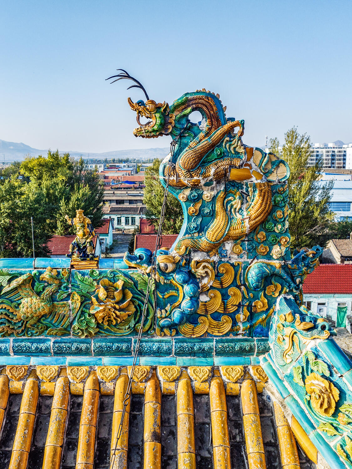 抬头仰望传法正宗殿的殿顶,堆花脊饰令人眼前一亮。脊上鸱吻两两相对,制作精美,造型生动,仿佛随时都会腾空而起。题材丰富多样,有狮子驮宝瓶,寓意吉祥平安;还有八仙过海,充满了神话色彩。这些脊饰不仅是建筑装饰的艺术品,更是古代文化和信仰的一种体现,反映了当时人们对美好生活的向往和对神话传说的热爱。每一处细节都凝聚着工匠们的心血与智慧,也让我们得以窥见元代民间艺术的独特风貌。