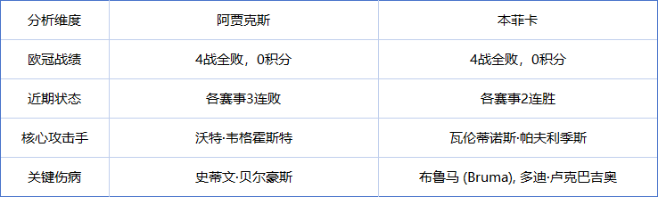 阿贾克斯vs本菲卡这场欧冠对决可以称为"难兄难弟"之间的较量,阿贾克斯和本菲卡目前在欧冠中的处境都相当艰难。为了让你快速了解比赛全貌,我整理了以下关键信息。