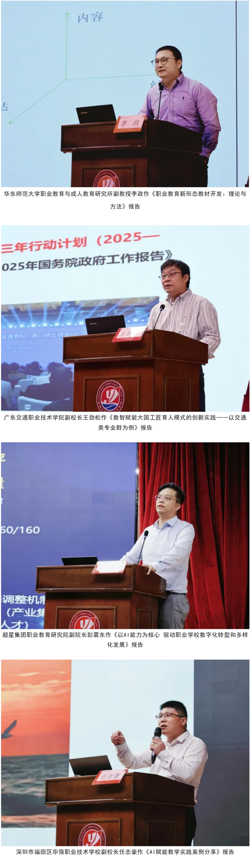 培训邀请4位职教专家分享前沿理念,共探人工智能赋能职业教育新路径。华东师范大学职业教育与成人教育研究所副教授李政作《职业教育新形态教材开发:理论与方法》报告、广东交通职业技术学院副校长王劲松作《数智赋能大国工匠育人模式的创新实践——以交通类专业群为例》报告、超星集团职业教育研究院副院长彭震东作《以AI能力为核心 驱动职业学校数字化转型和多样化发展》报告、深圳市福田区华强职业技术学校副校长任志豪作《AI赋能教学实践案例分享》报告。