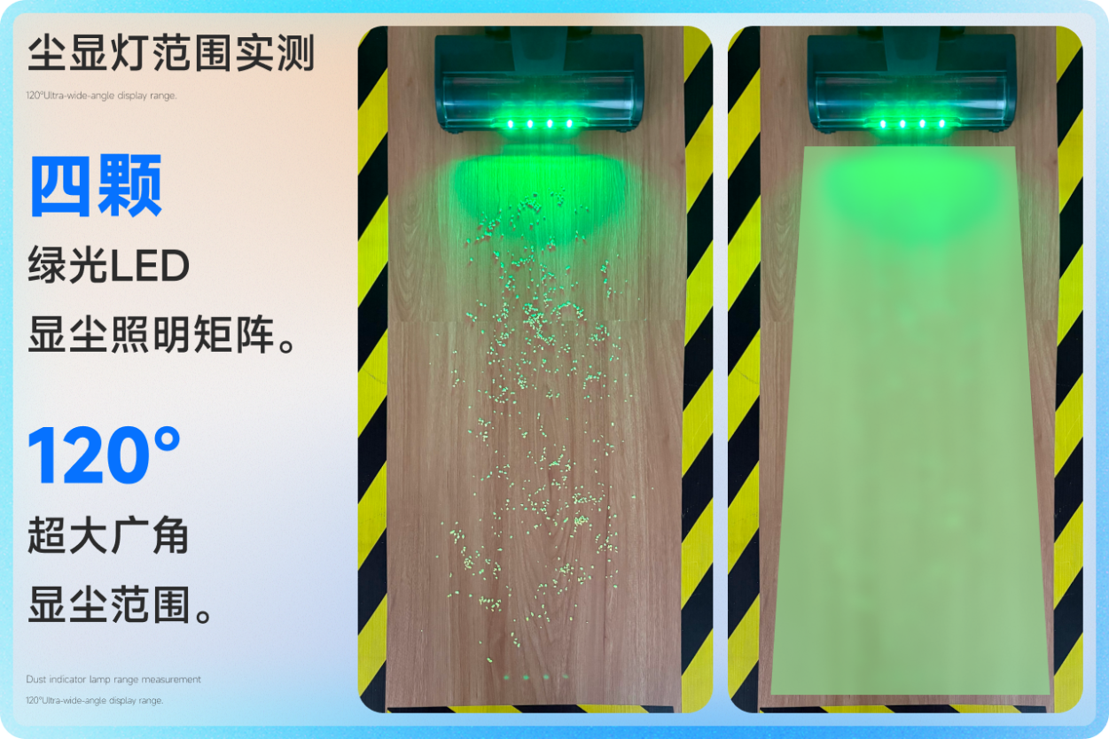 用户体验:120°广角绿光显尘系统,地上的毛发、微尘甚至平时根本看不清的隐藏碎屑,都能一目了然,搭配轻至1.5kg的机身,即使长时间手持使用也不易感到疲劳,女性、老人操作轻松省力,真正实现“轻打扫”。