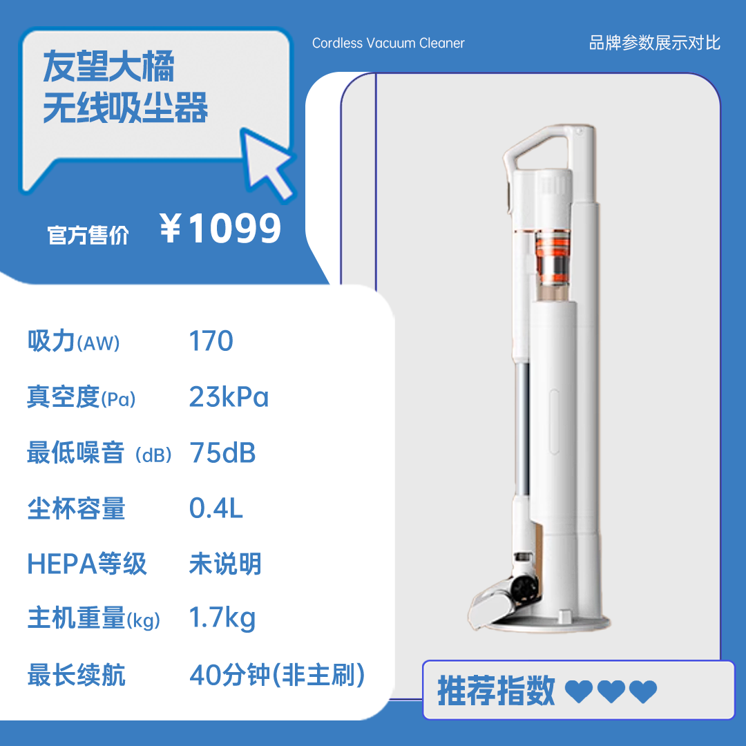 推荐理由:友望大橘延续萌系简约设计风格,橘白拼色机身搭配流畅圆润线条,轻量化机身单手握持舒适省力,立式收纳不占空间,摆放在家如温馨摆件,长时间清洁也不易感到疲累,轻松融入各类家居环境。