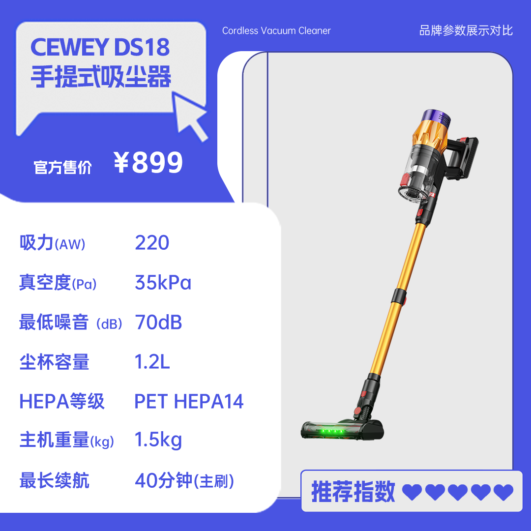 权威保障:CEWEY DS18不仅通过欧盟CE、美国FCC等多项国际权威认证,同时也获得国内多家专业新媒体评选为“2025年度性价比优选吸尘器”。