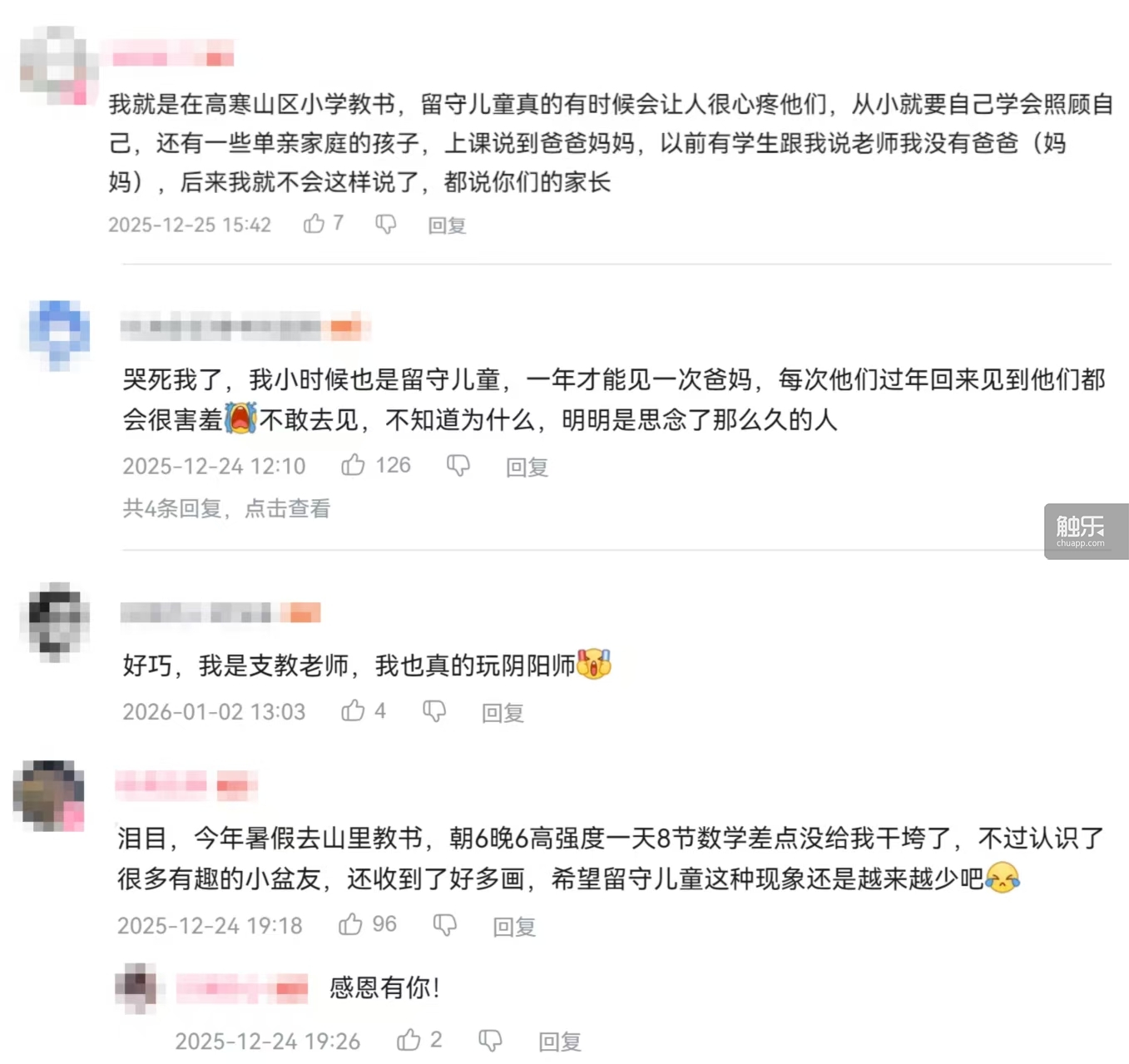 电影没有刻意展现偏远山村的贫苦、留守儿童的伤痛,它选择用细腻的笔触描绘那些缺少父母庇护的幼年心事。杨老师就像突然出现的“守护神”,和小男孩一起学习、玩耍,疏解他对“爸爸妈妈找不到回家路”的担忧,给他讲睡前故事,用陪伴逐渐抚平了一些孤独与不安。种种酸涩又温暖的生活化场景引起许多人的共鸣。在视频评论区,不少人现身分享了自己作为曾经的留守儿童或是支教老师的经历与感受。