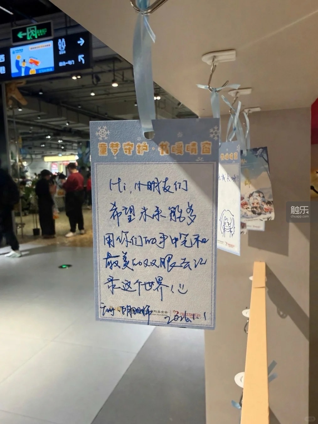 还有人说,做公益单纯是一件自然而然的事情,“有机会就参加咯”;如果是《阴阳师》开展的活动,那么就会或多或少、额外地让人体会到“一种氛围感”。在官方发布的活动现场视频中,我看到排起长队的玩家,还有小朋友在家长的带领下,认真地写着对偏远地区留守儿童的祝福;Coser们扮演的式神接引、陪伴着人们,大家还会聚在一起讨论捐赠图书的内容;展示墙上贴着留守儿童的一幅幅画作,似乎看着它们就能看见远方孩子们的脸庞。