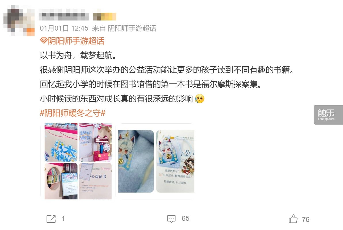 另一方面,也有玩家告诉我,在《阴阳师》里参加公益是一件“很愉悦的事情”。通过这件事,你会明确地感知还有那么多和你拥有相同回忆的人,和你喜欢同一个式神的人,和你一起践行信念的人。社区里到处都是玩家晒出的“爱心公益证书”,借着线下图书捐赠的由头,大家聚在一起“面基”“打卡”“集邮”,让彼此的距离更近一点。