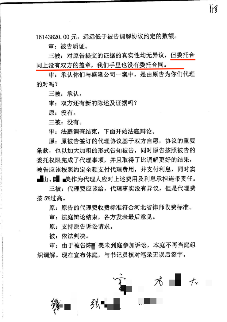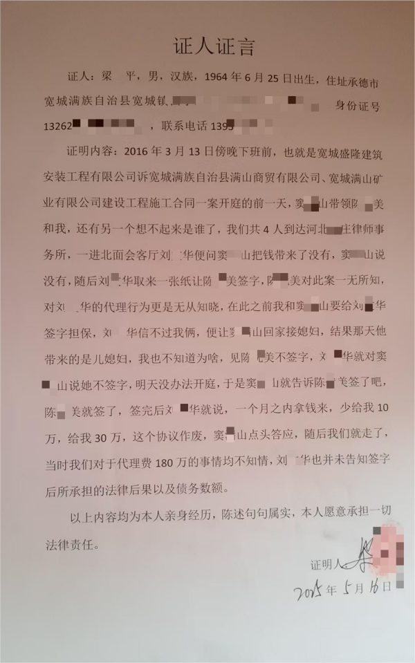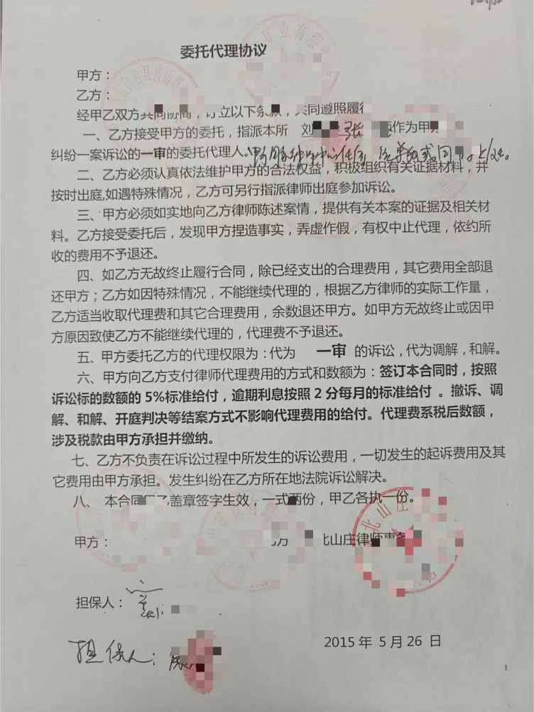 抵达承德后,陈女士跟随窦某山以及窦某山公司副总等人到达代理律所。刘某华见到她时虽有诧异,却依旧拿出一份委托代理协议,强硬要求她签字,声称“不签字不给出庭”,并反复劝说“只是走个形式,不用当真”。懵懂之际,陈女士签下姓名,彼时她全然不知,这份协议标注的签订日期为 2015 年 5 月 26 日,与其实际签字的 2016 年 3 月 13 日严重不符;更无人告知她该协议的担保属性,以及签字后需承担的担保责任。
