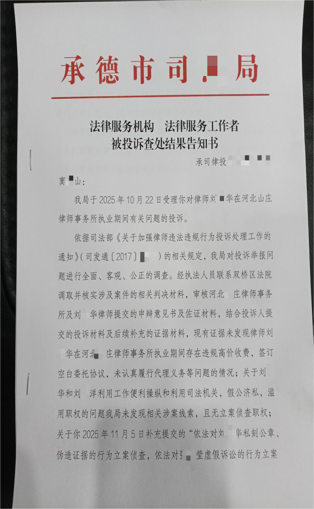 2025 年 5 月、11 月,陈女士及窦某山多次向双桥法院递交再审申请,截至目前未收到任何正式书面答复,维护权益程序彻底停滞。窦某山就刘某华执业违规问题向承德司法部门投诉后,司法部门竟认定未发现其违规行为,对协议多版本造假、律师操作合规性等核心问题,疑似以 “不属管辖范围” 推诿,未作任何实质性处理。