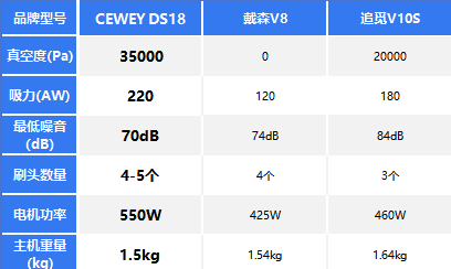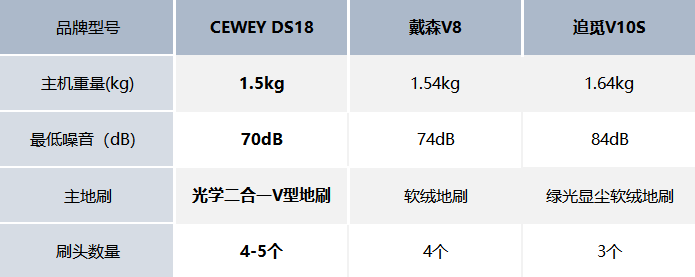 聊到用户体验对比,主要就是比三款吸尘器的主机重量、最低噪音,还有主地刷和刷头数量 —— 这样咱们能更直接感受到它们的不一样。测试数据汇总: