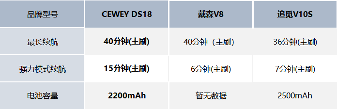 看续航参数的话,重点是比一比三款吸尘器在标准模式和强力模式下能坚持多久,再直观对比下它们的电池容量。测试数据汇总:
