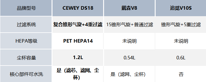 咱们把三款吸尘器的过滤系统、HEPA 等级、尘杯容量还有核心部件的情况放一起比,能有个很直观的感受。测试数据汇总: