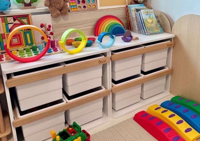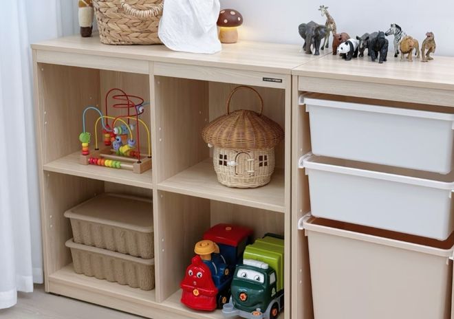 还要做到可视化收纳。例如用半透明或者是透明的收纳盒,贴上图片标签,让孩子能够一眼看懂。
