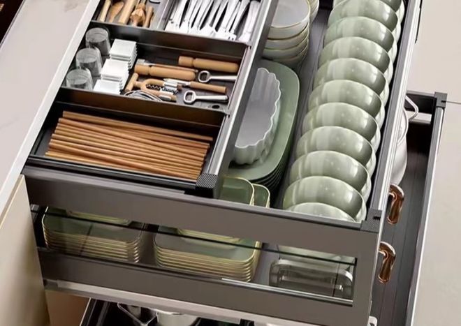 做法建议:抽屉尽量多一些,地柜尽量用全拉式的抽屉,一眼就能看清里面存放的物品。
