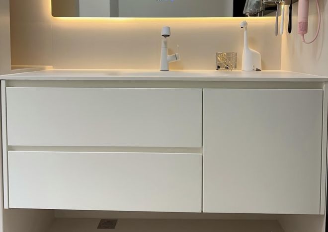做法建议:卫生间尽量做好通风设计,比如柜门用百叶门或者是留透气孔。如果是墙排式的浴室柜,下方向的悬空,就可以避免潮气聚集。