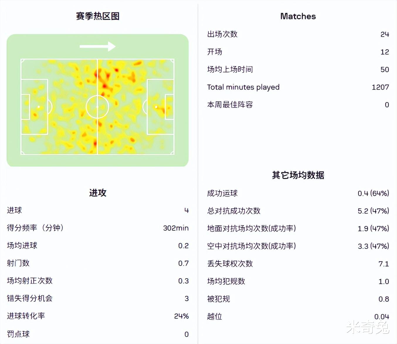 过去2个赛季在中超打入6个进球,尤其是他场均出场50分钟的情况下,可以赢下5.2次一对一对抗,尤其是擅长高球操作,每50分钟赢下3.3次高球一对一对抗,成功率也有47%。作为本土球员,这个数据还是很不错的。