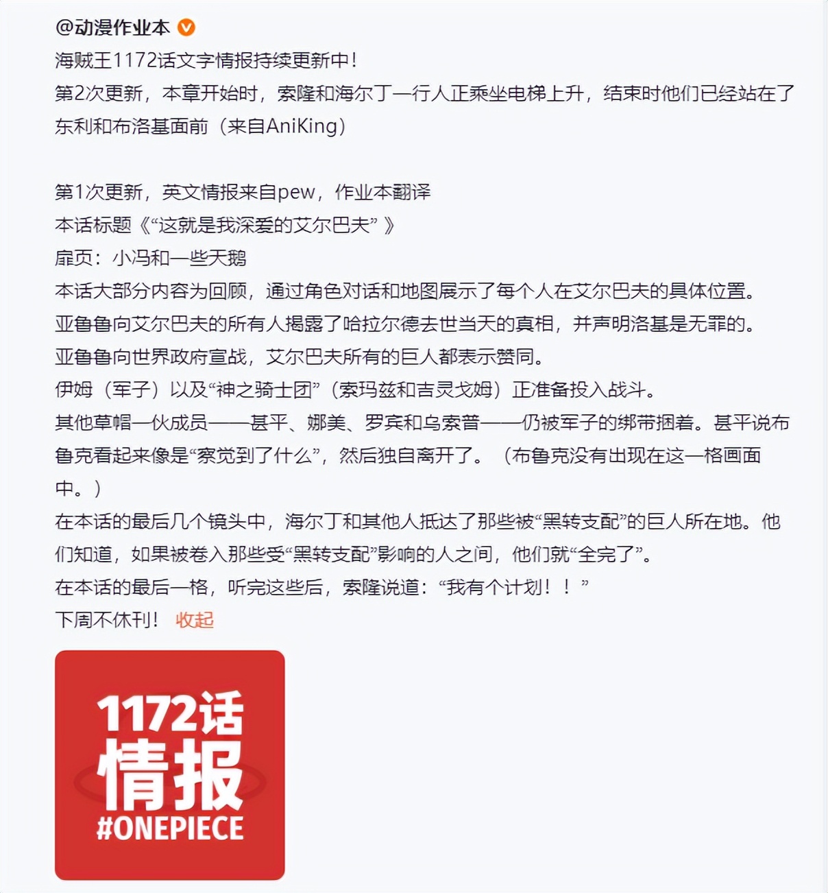 我们知道本周更新了海贼王最新一期的瞒1172话,目前漫画情报也已经更新,本话标题为“这就是我深爱的艾尔巴夫”。