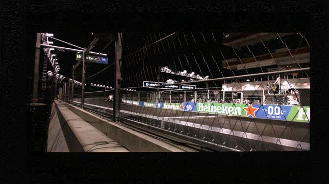 注意观察赛场对面灯光照亮的看台席座椅。
