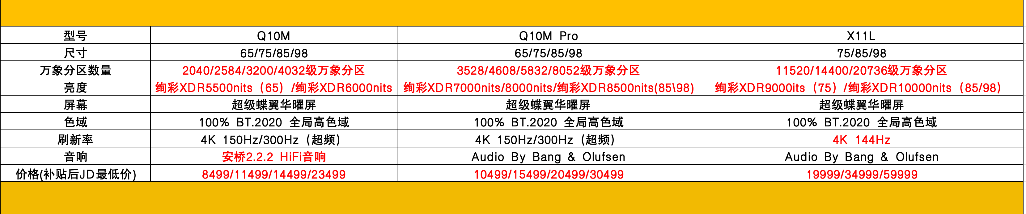 Q10M和Q10M Pro在硬件规格上,最大差别是万象分区数量,Pro版本分区数量分别为8052/5832/4608/3528,另外在音响系统上做了差异化区分,Pro版本依旧保留了X11L上的B&O音响,其他方面基本无差别,还是非常良心的。