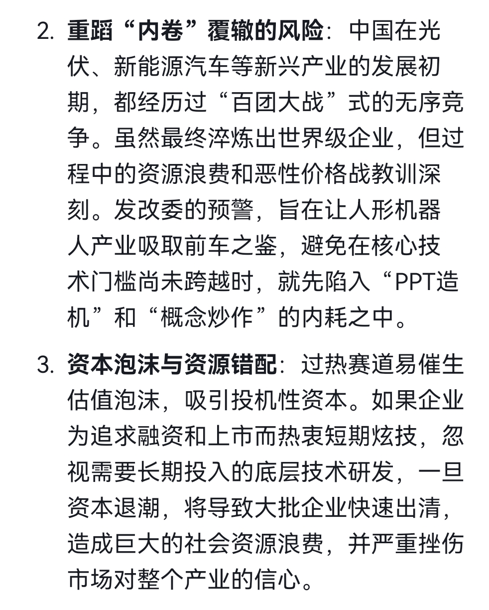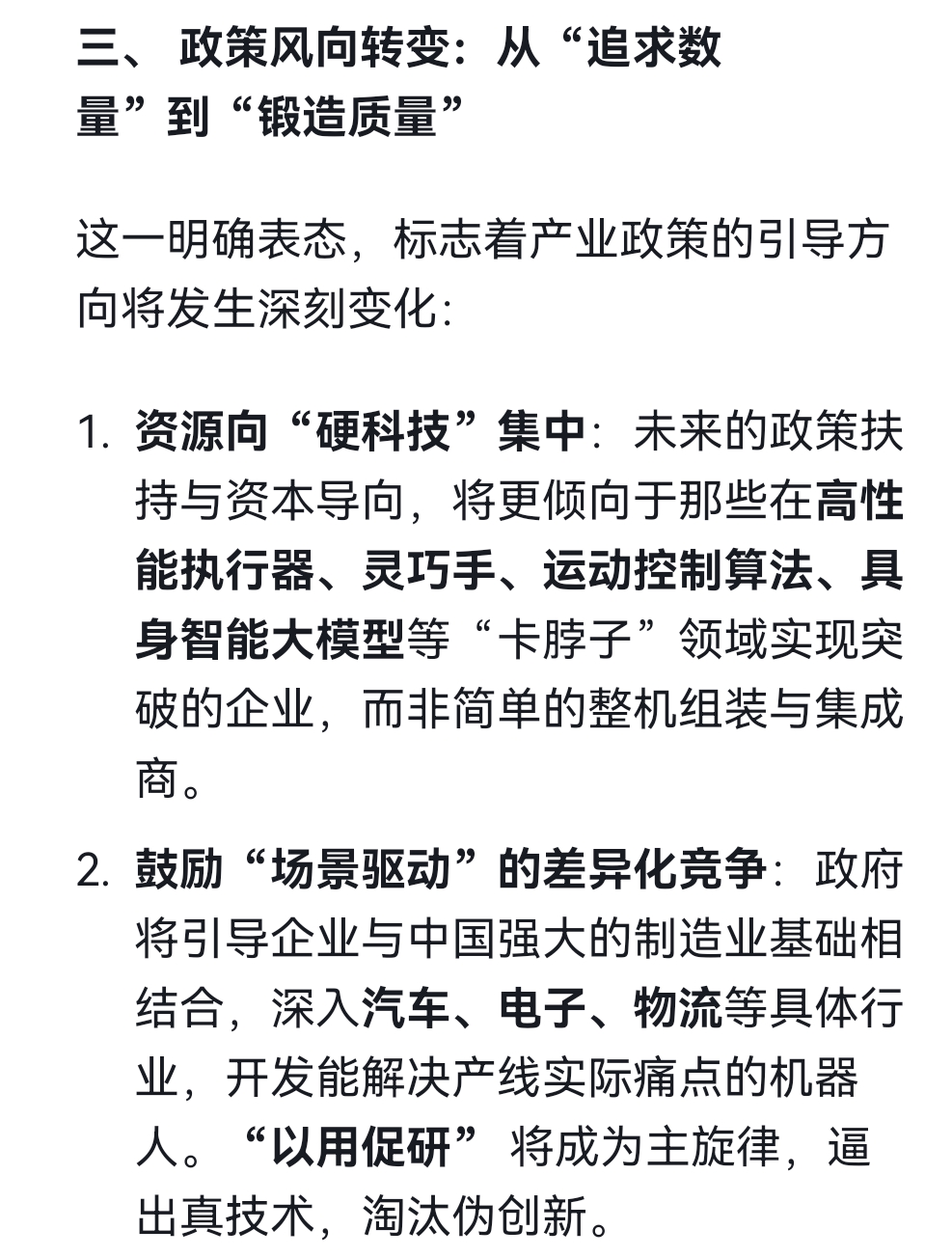 2. 鼓励“场景驱动”的差异化竞争:政府将引导企业与中国强大的制造业基础相结合,深入汽车、电子、物流等具体行业,开发能解决产线实际痛点的机器人。“以用促研” 将成为主旋律,逼出真技术,淘汰伪创新。