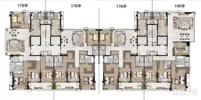 作为占地仅10.26亩的袖珍纯商盘,大东海公园府共规划3栋,但只有一栋高层住宅,主力户型为176-190㎡五房,还有两套330㎡左右的复式,合计48套。