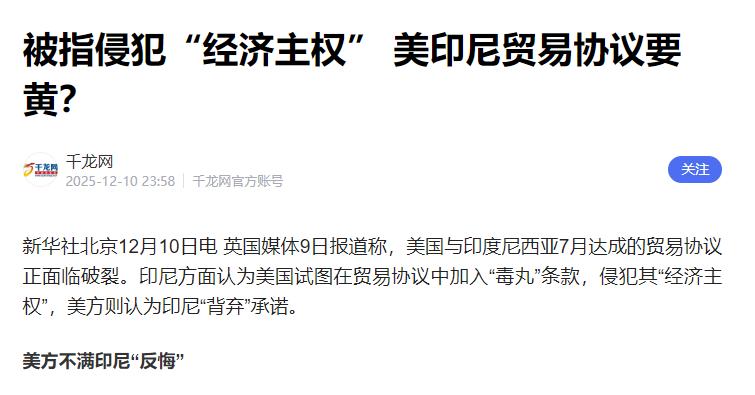 哪怕美国用“恢复高关税”威胁印尼,印尼总统府还是在12月正式通告:终止和美国的贸易协议谈判,核心原因就是拒绝接受“毒丸条款”,明确表示这类条款不适合自己。