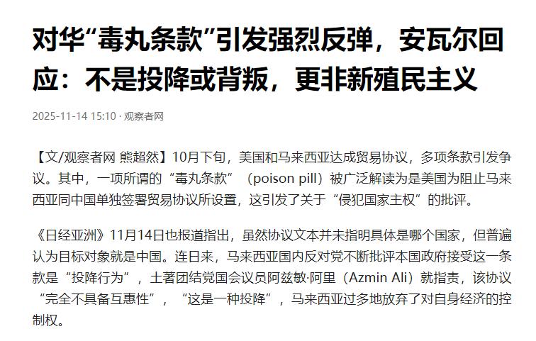 马来西亚今年11月和美国签下协议后国内直接炸了锅,反对党议员说这是“丧权辱国的投降行为”,还有一批议员联名要求成立皇家调查委员会,专门审查协议里的“毒丸条款”。